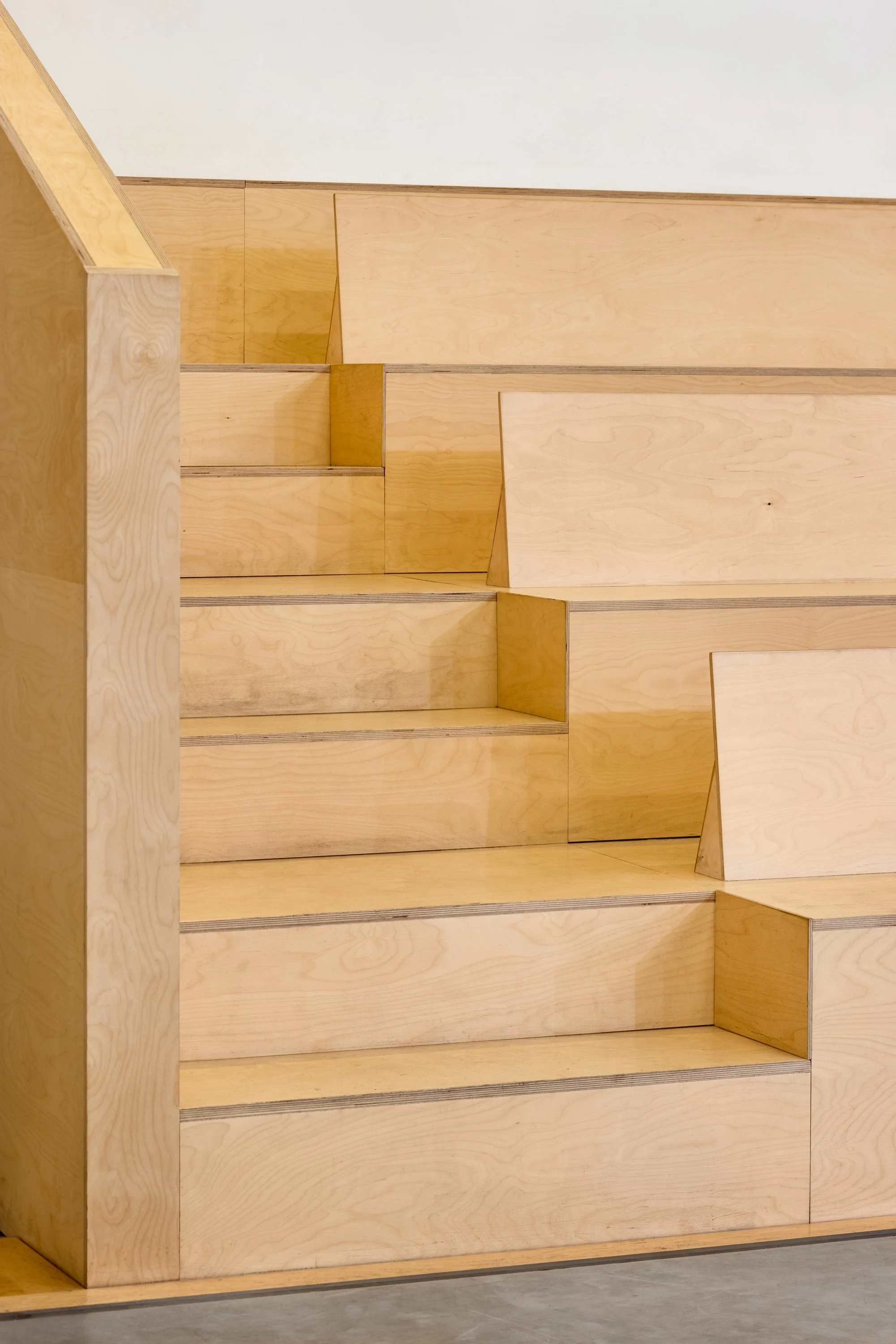 The bleachers and individual seating modules were a collaboration between the architect and a local furniture maker. In designing the bleachers and backrests, careful considerations were made to maximize the yield of the plywood used and minimize waste. To further reinforce the minimal design approach, an integrated, recessed handrail was designed into the sidewalls of the bleachers.