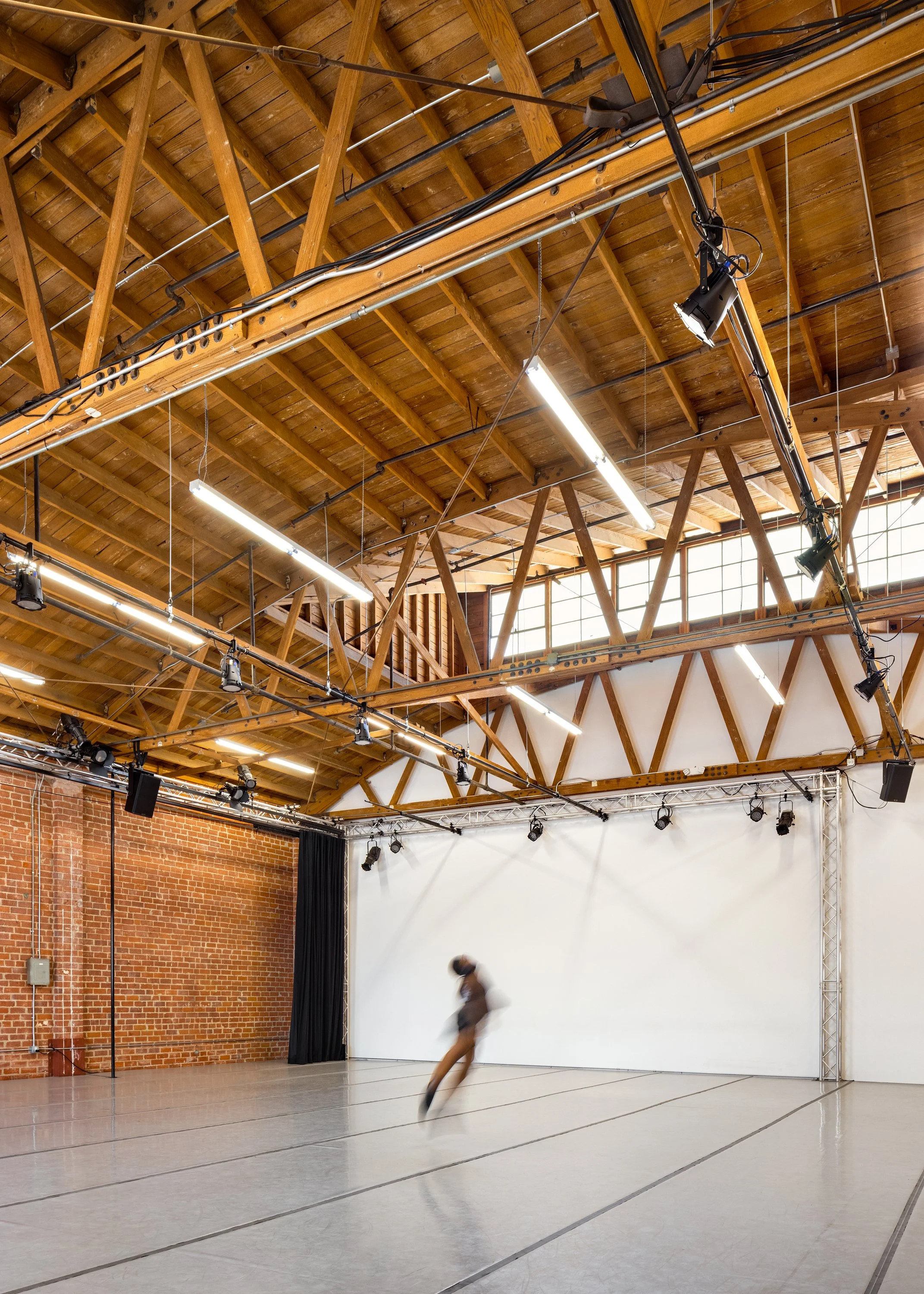 Creative floor planning drove the design to maximize flexibility. Each primary space can serve a multitude of functions depending on the need because of its adjacency to one another and its location within the building. Studio A serves as the primary rehearsal and performance space for LA Dance Project but can also be used for community programming and visiting artists without displacing the company’s dancers or disrupting operations. Studio B’s location allows it to double as backstage on performance nights or as a second studio when Studio A is being utilized for community functions.