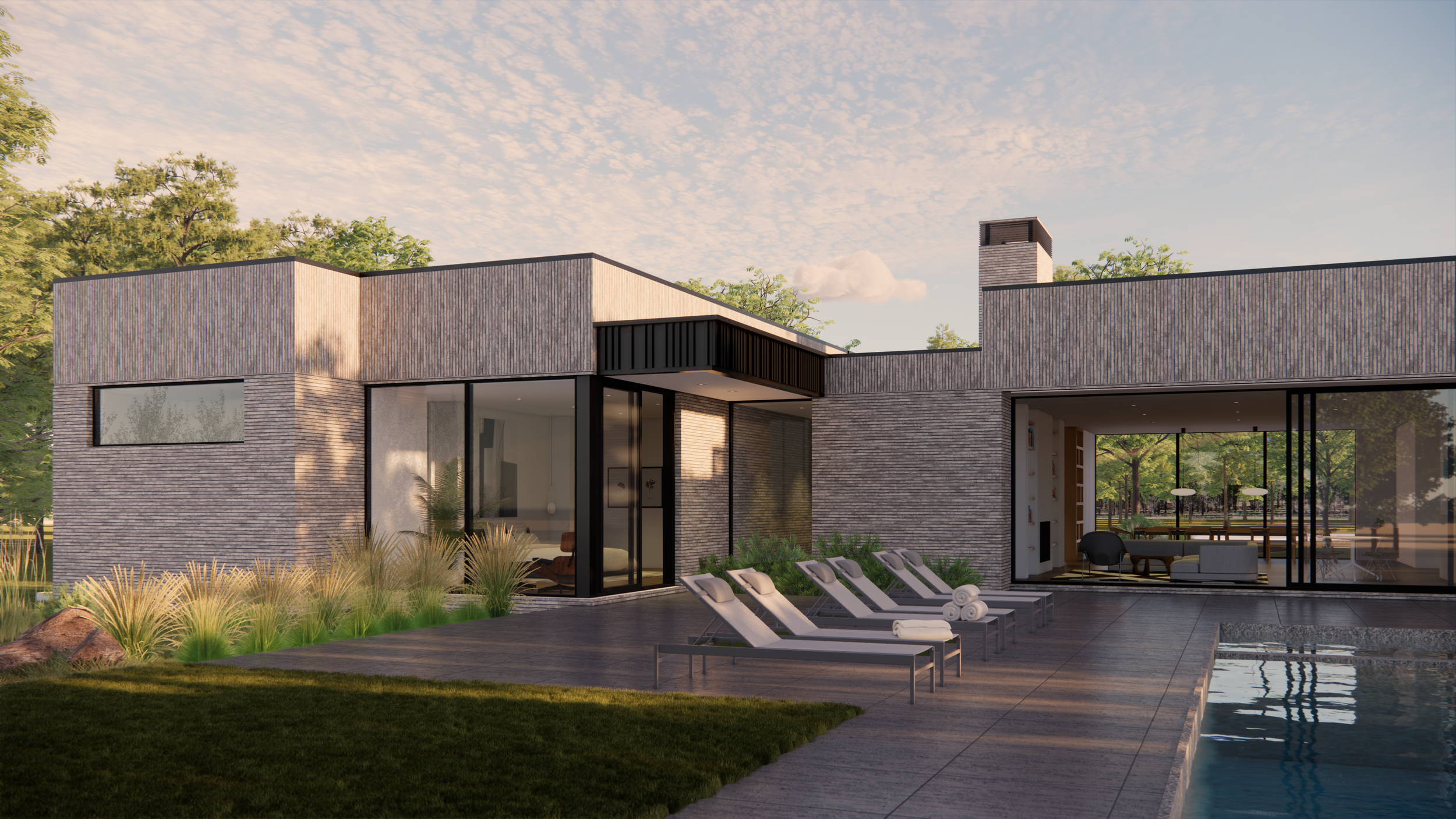 The house is clad in a custom-fabricated concrete “brick” with a long, slender profile to accentuate the horizontality of the home and shoreline. Three complementary brick colors are used to create a texture that softens the bold contrast of the white against the landscape. The result is a striking form that sits within the changing landscape. High-efficiency, all-metal windows and multi-slide doors contrast with the brick and frame views and reflections of the surroundings.