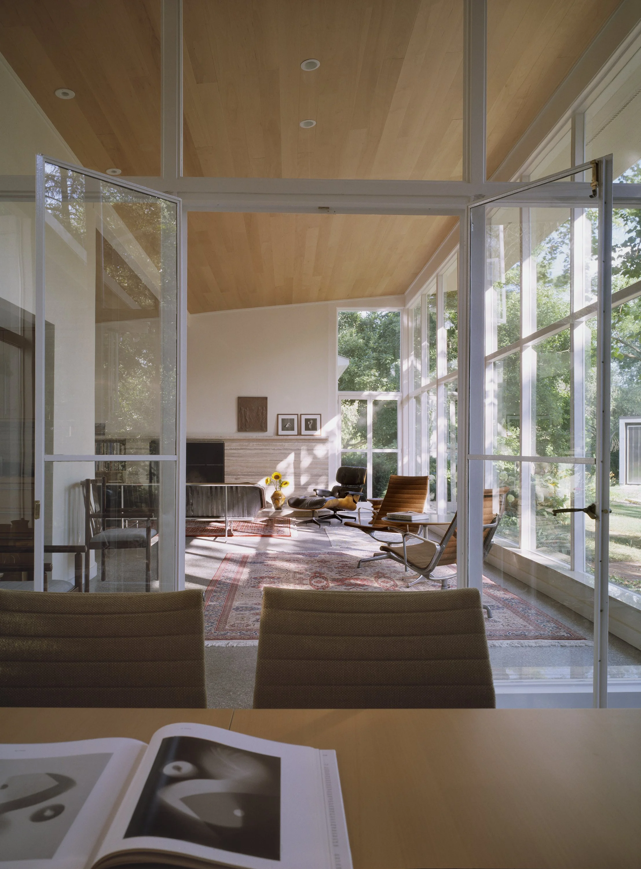 The design restored the original steel-framed glazing, replaced the floor slab with bespoke pigmented and polished concrete, added a second-floor bedroom, and renovated the entire home.