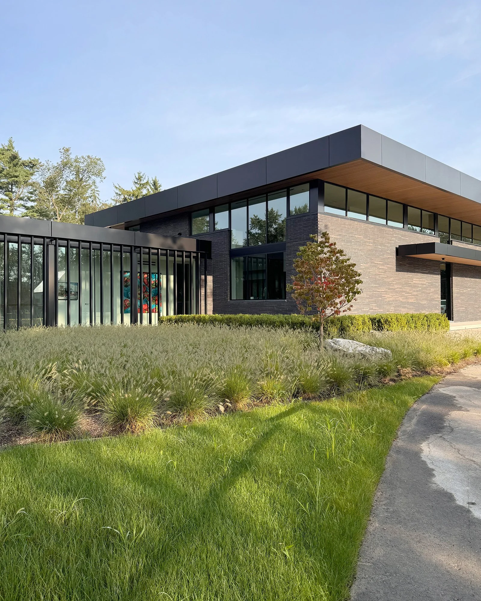 Throughout the interior, large planes of simple materials define views and create visual impact: marble floors define the monolithic ground plane, while the 18-foot-high plaster ceiling transitions to Douglas fir at the clerestory, drawing the landscape and sky inwards. Further dissolving the barrier between the interior and exterior, the handmade bricks of the façade slip past the windows at key areas to clad interior walls.